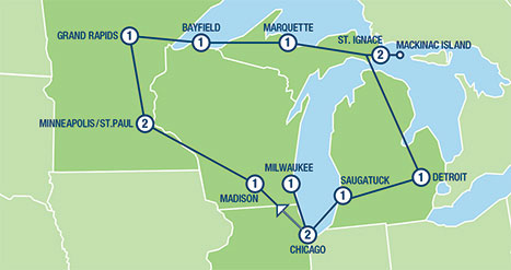 Grand Rapids in Michigan, die beste Bierstadt Amerikas, ist die nĂ€chste Station. Mehr als 40 Brauereien gibt es hier. Das Ziel ist Saugatuck, eine bezaubernde KĂŒnstlerkolonie am Lake Michigan. Ein Abendessen am Hafen ist ein wĂŒrdiger Abschluss dieses Tages